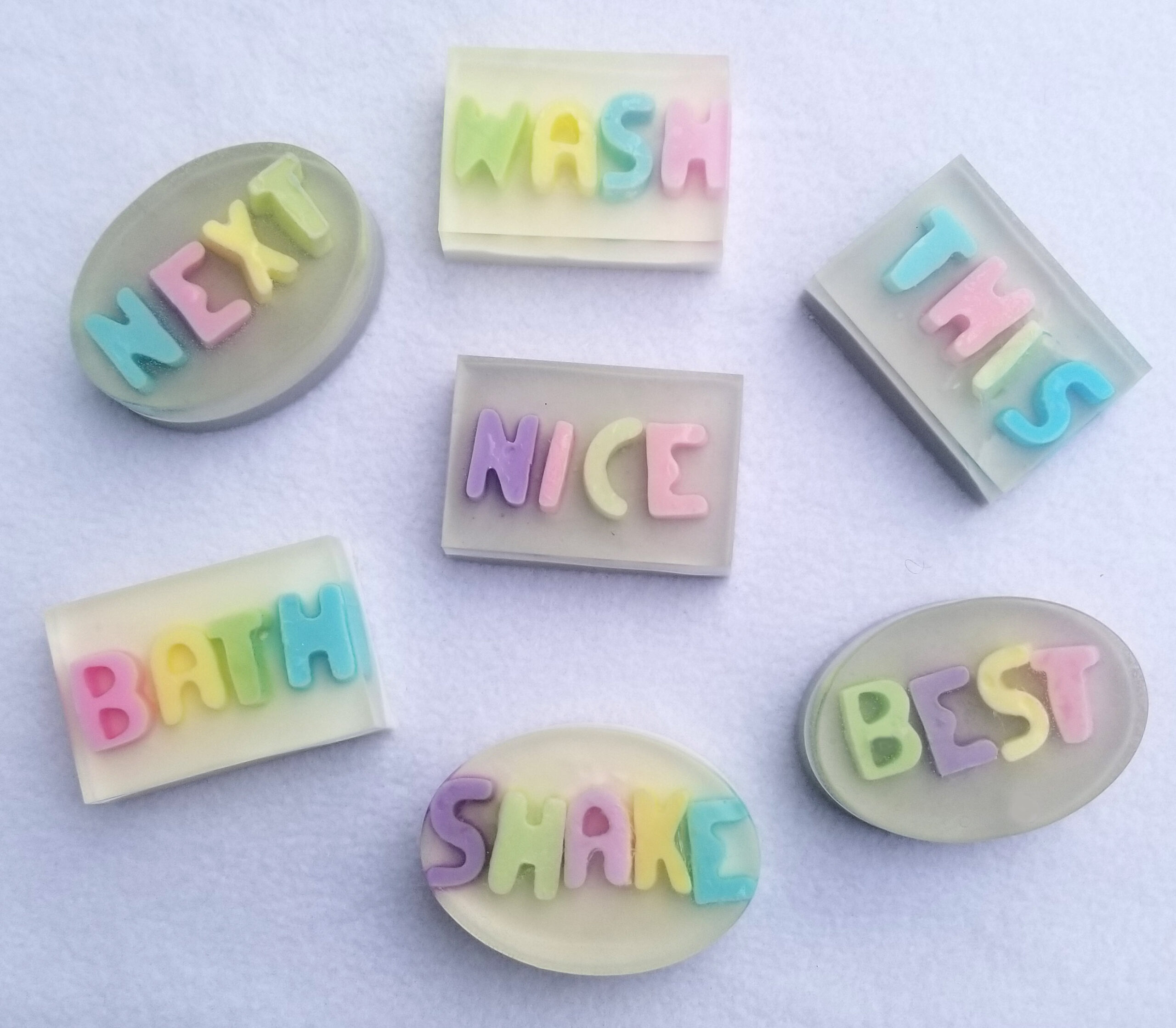 Colorful Text Soaps Send a message with these seven colorful word soaps. Message us if you want a particular word or name in your soaps. Just go to our contact page after you place your order. You get seven soaps in a gift box. Choose your fragrance below. $16.50 Fragrance Crisp Pear Cucumber Melon Unscented