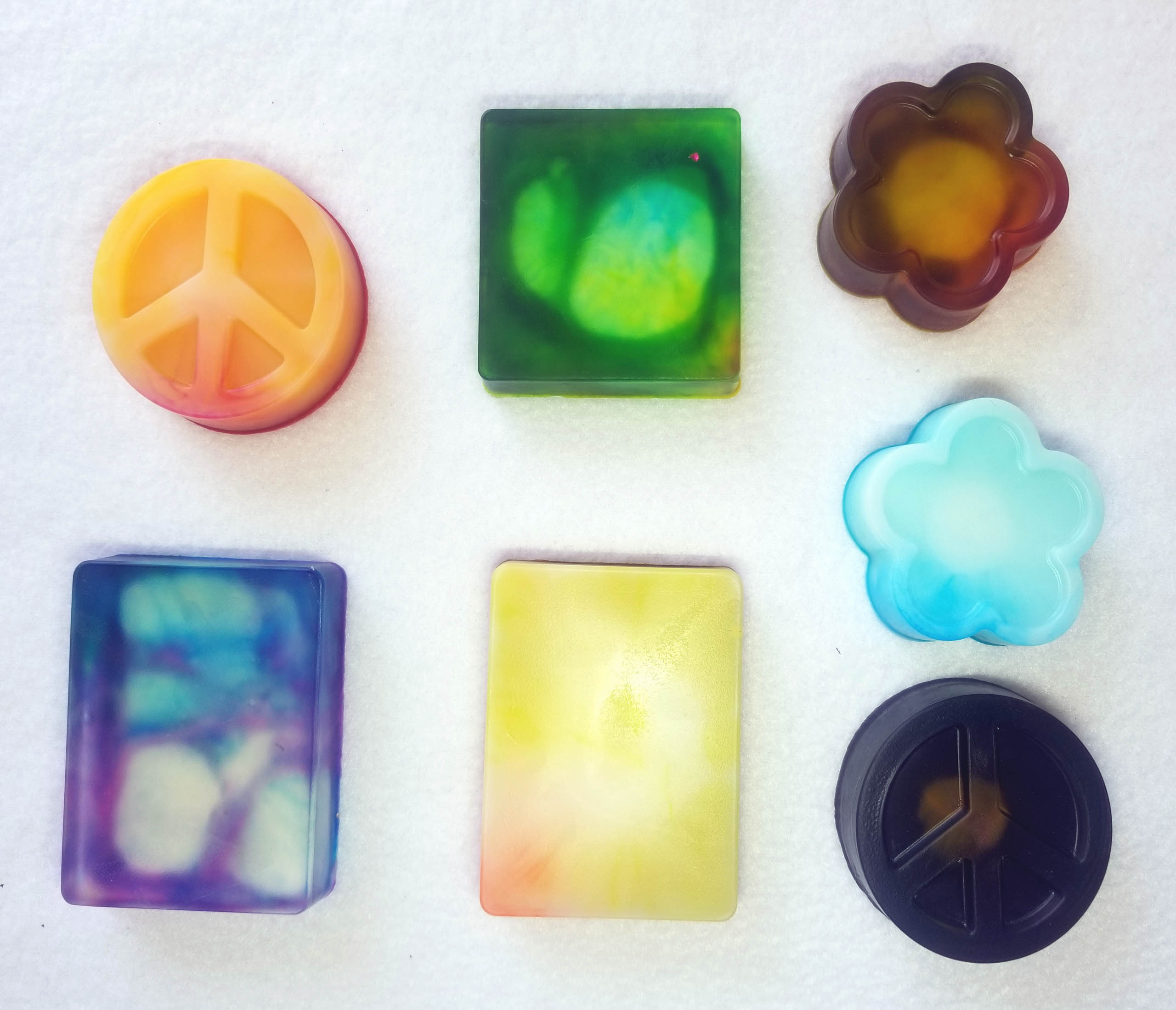 Peace, Love and Soap Groovy mix of goat milk and glycerin soap come in assorted tie-dye colors. Seven soaps come neatly wrapped. $17.00 Fragrance Cucumber Melon Crisp Pear